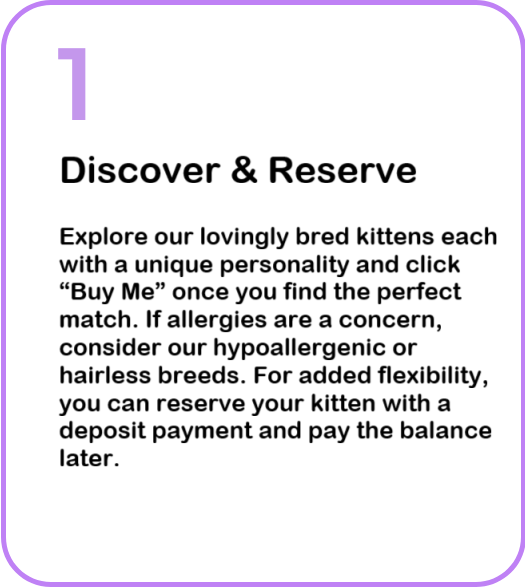 Your journey to finding the perfect kitten starts here. Browse our lovingly bred kittens each with a one of a kind personality and choose the one that truly speaks to you. Take your time exploring our selection: every breed has its own grooming needs, activity level, and temperament. If you have allergies, be sure to check out our hypoallergenic or hairless breeds for extra peace of mind.