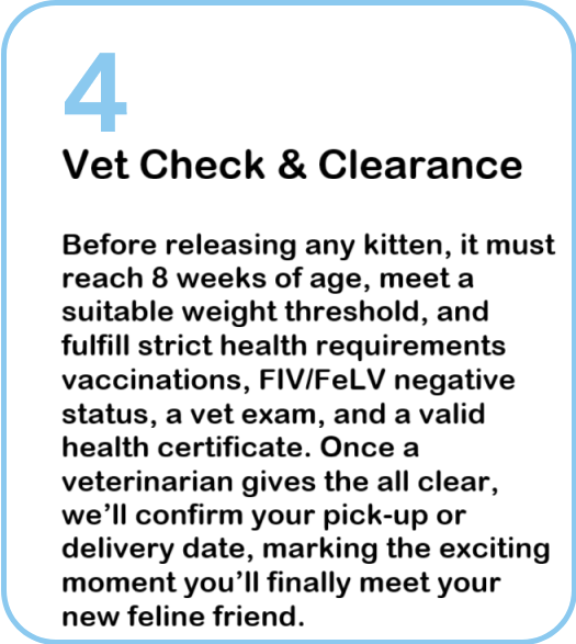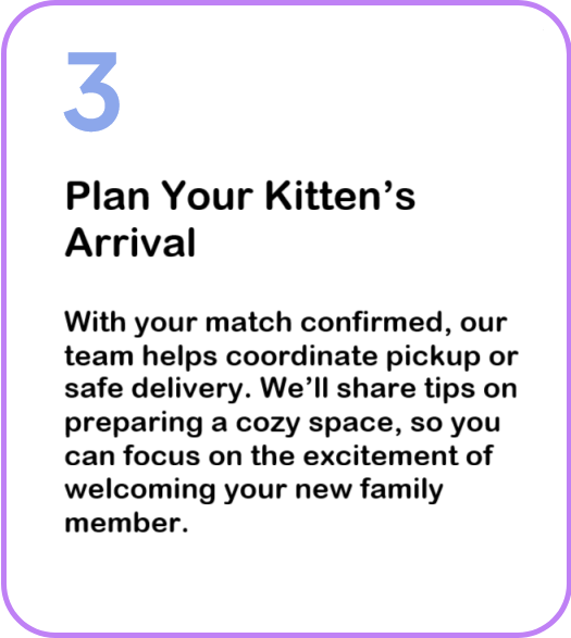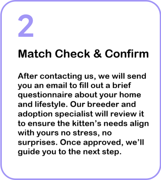 Once you’ve set your heart on a kitten, simply click “Buy Me,” and we’ll hold your chosen companion no stress about missing out. It’s a smooth first step toward welcoming a new family member. And if you have any questions about breed traits, kitten care, or anything else—our friendly Adoption Specialists are always here to help.